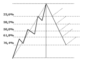 Как правило, точкой отсчета является максимальное значение предыдущего трендового движения. Направление скоростных линий определяется проведением линии от точки отсчета до линии сопротивления. Этот отрезок делят на размеры поменьше — 2/3, 1/2 и 1/3 длины основной линии. После этого через эти точки прокладываются сами линии.