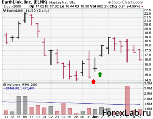 Следующий график акций Earthlink (ELNK) отображает частичный разрыв вверх 1 июня (красная стрелка), и полный разрыв вверх 2 июня (зеленая стрелка).