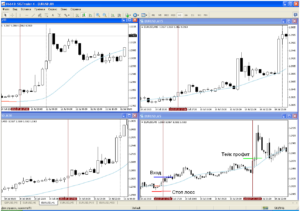 Когда цена прошла 70-100 пунктов от точки входа необходимо стоп передвинуть в безубыток. Далее, если тренд развивается в нашу сторону, тогда стоп передвигать за новые текущие локальные максимумы или локальные минимумы.