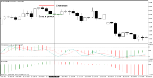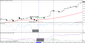После выполнения всех условий необходимо войти в рынок по текущей свече. Стоп-лосс необходимо выставлять за текущий экстремум с учетом спреда по данной валютной паре.