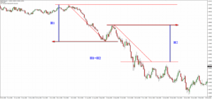 - Если нужно определить цели для фигуры, которая прорвана вверх необходимо построить линию параллельную линии поддержки. Если же нужно определить цели для треугольника, прорванного вниз, то через нижнюю точку основания нужно построить линию параллельную линии сопротивления – она будет считаться минимальным ценовым ориентиром.